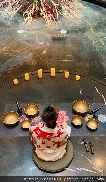 到前台Check-in時端上茶水,服務人員給予我們體驗短暫敲鉢儀式,從震動音頻彷彿感受到一股神奇能量。接著服務人員給我們填寫問卷,從性格個性發質等等方面判定類型後,給你一個顏色小手環。告知用餐時餐廳會根據手環給予適合的果汁和夜宵,這也太特別了吧!